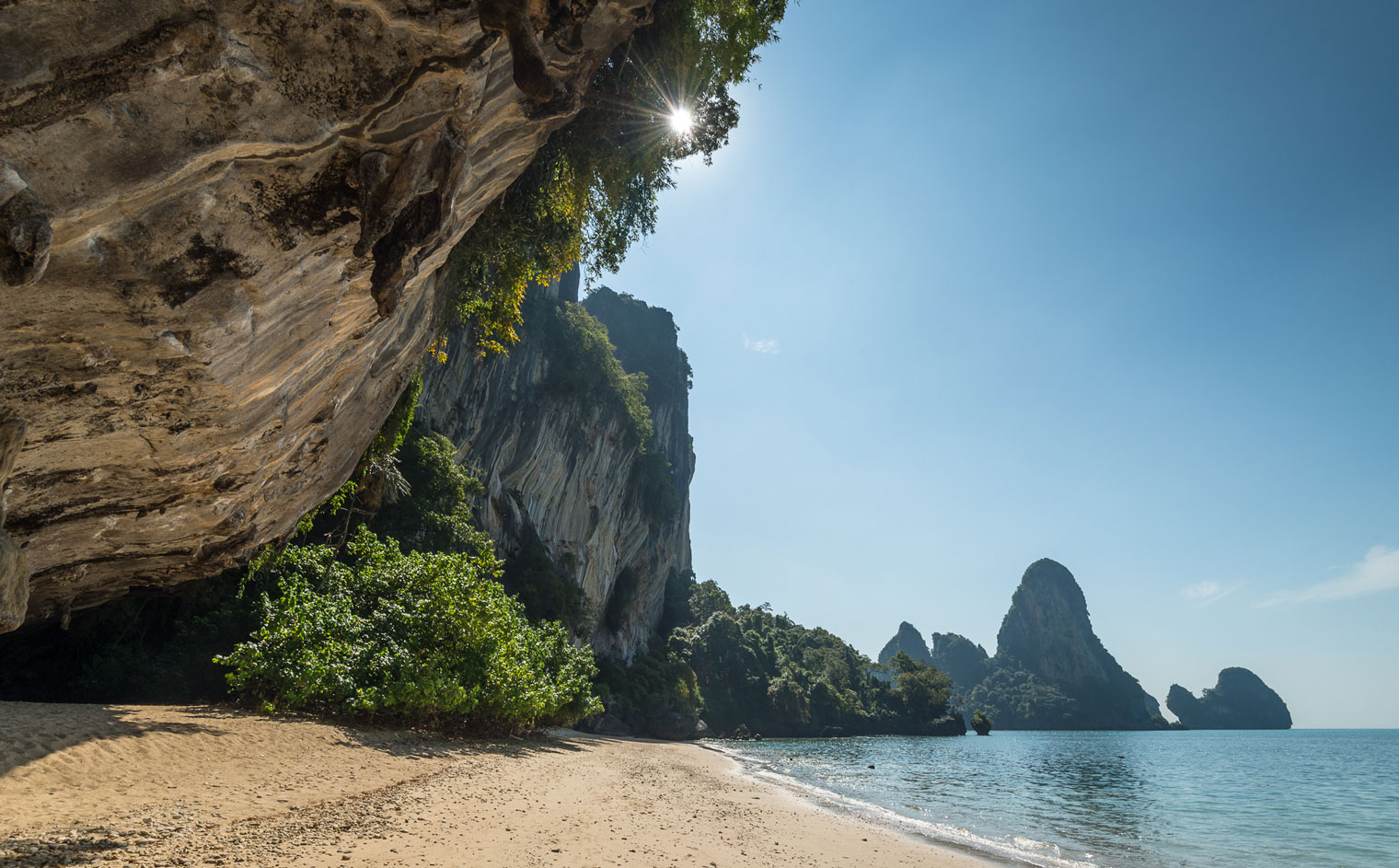 Tonsai’s “big brother” Railey Beach is certainly worth a visit. Accessible either by the jungle path or via longtail boat, Railey, is a favorite destination for many visitors to Krabi with white sand beaches, towering limestone cliffs, viewpoints, caves and lagoon hidden inside the cliffs, shaped and fed by the changing tides.