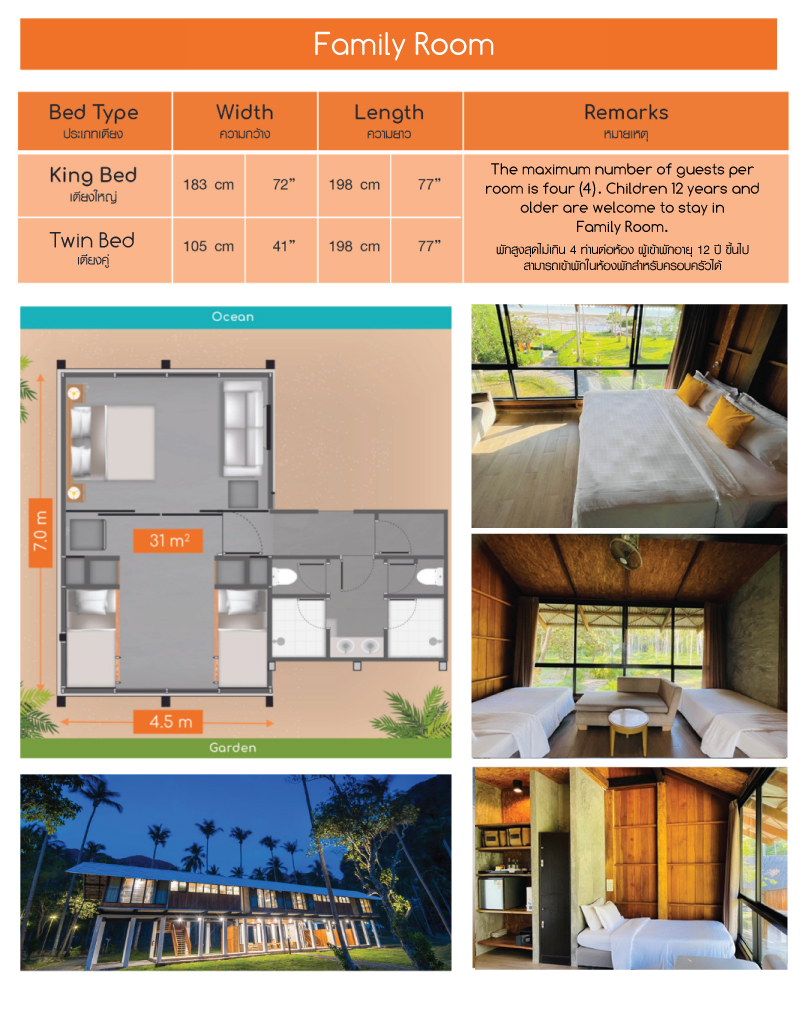 Comfortably sleeping 4 and ideal for families or group of friends, spacious family rooms are furnished with 1 King-size bed and 2 Single beds with own shower and toilet facilities. Air conditioning